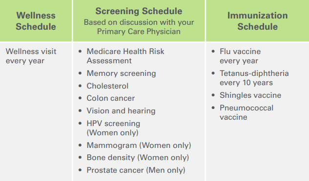 Advanced Care Planning can be completed at any age. Get started at your next annual wellness visit. Click on your age range below to learn more about your recommended preventative care schedule.