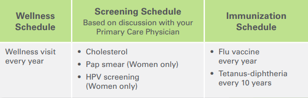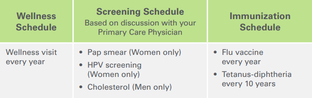 Health care is not “one size fits all”. Depending on your health and personal risk factors, your preventive care schedule may differ from the standard recommendations. Talk with your physician about a schedule that’s best for you. If you have particular risk factors such as a chronic disease, obesity, or a family history of a disease, additional screenings may be recommended.