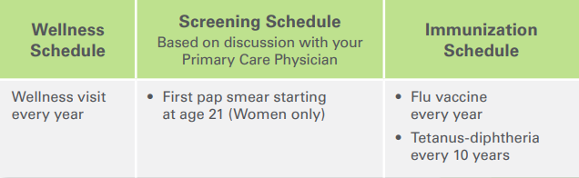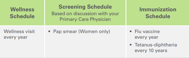 Health care is not “one size fits all”. Depending on your health and personal risk factors, your preventive care schedule may differ from the standard recommendations. Talk with your physician about a schedule that’s best for you. If you have particular risk factors such as a chronic disease, obesity, or a family history of a disease, additional screenings may be recommended.