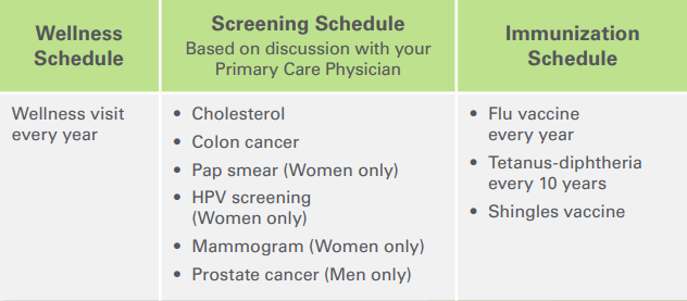 Take charge of your health care by staying current with your wellness visits, screenings and immunizations.